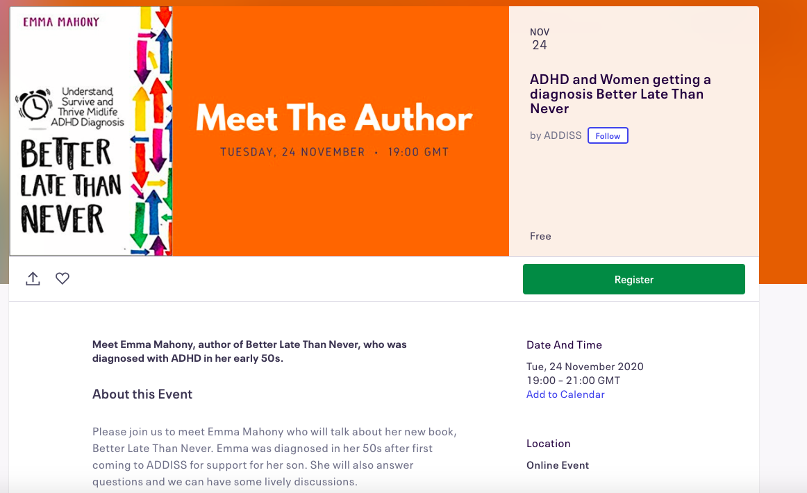 ADDISS – the ADHD Information Service is one of the best places to head, for any parents or adults who are struggling with problems around diagnosis or children with ADHD. This year they are celebrating their 25th anniversary and the great Andrea Bilbow OBE – who runs the organisation – is still organising events despite Covid derailing their plans for a packed programme. I am pleased to join her tomorrow to talk about Women and ADHD on Zoom – so come and join us here if you want to learn more here. Tickets are free here.